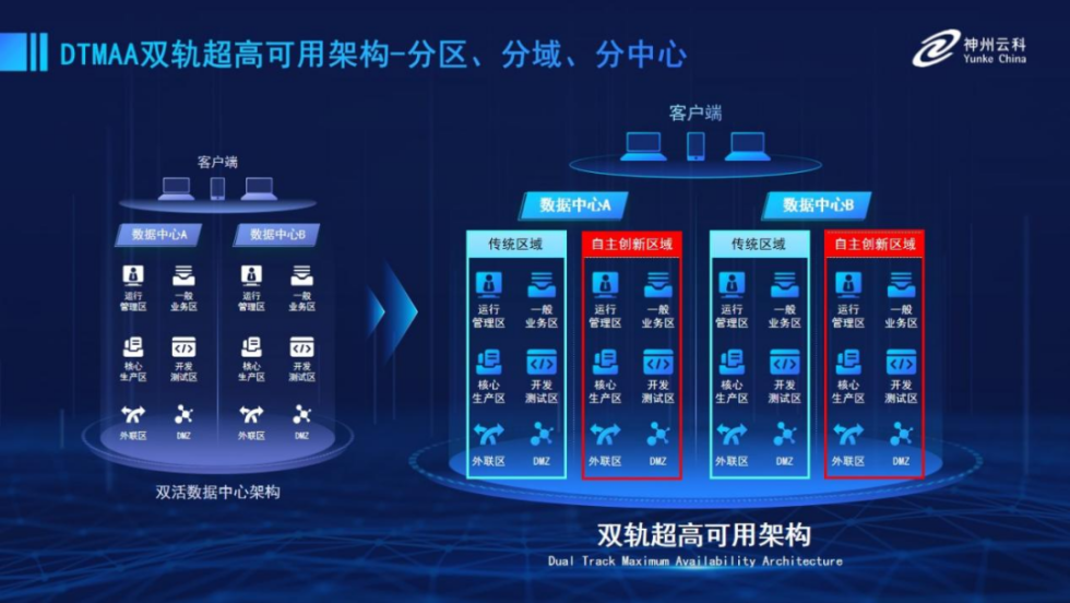 为帮助金融客户更好地应对数字经济时代对可持续性的高要求,实现“信创”与“数字化”齐头并进,bbin宝盈集团官网推出了双轨超高可用架构。该架构在双活数据中心的分区调度基础上,增加信创域和非信创域的分域调度,实行信创域与传统域应用全量部署,使双中心运营变为双中心四区域并行运行,互为多活,将“0到1”的单轨建设道路变为分区分域协同的多活双轨超高可用架构。帮助客户在新架构下,保障“信创”的同时解决性能瓶颈,提升稳定性,保证应用可持续性,最终实现信创区域和非信创区域的平滑过渡,完成国产化替代目标。